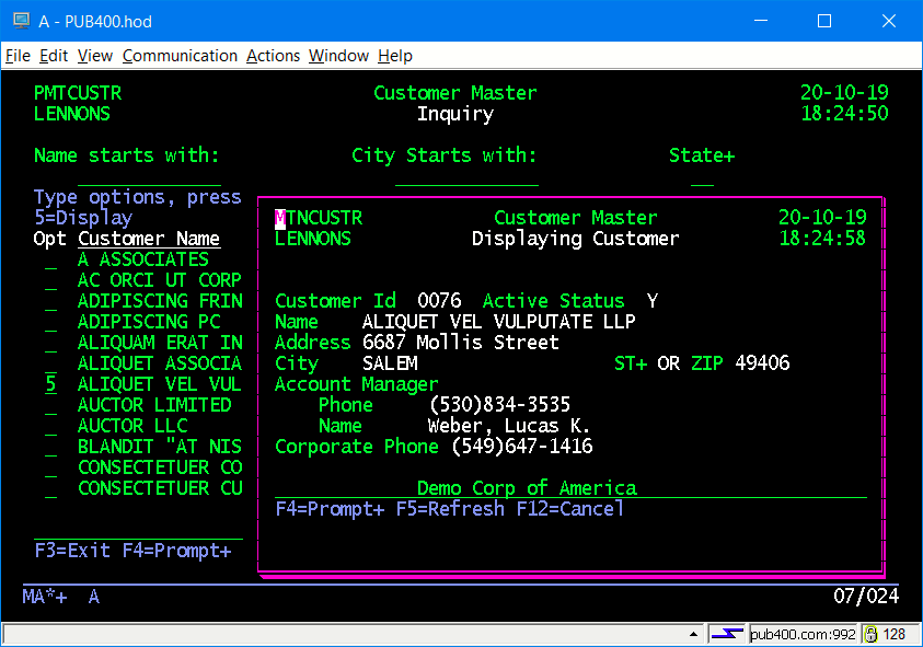 This is a working application that allows display, selection and maintenance of a customer master. The screens are similar to what you see in PDM. The code is modular and there are several programs that can be called from multiple places. SQL is used for all database IO. There are "page at a time" subfiles (full screen and in a window) and a "load all" subfile in a window. The windows show a couple of border styles.