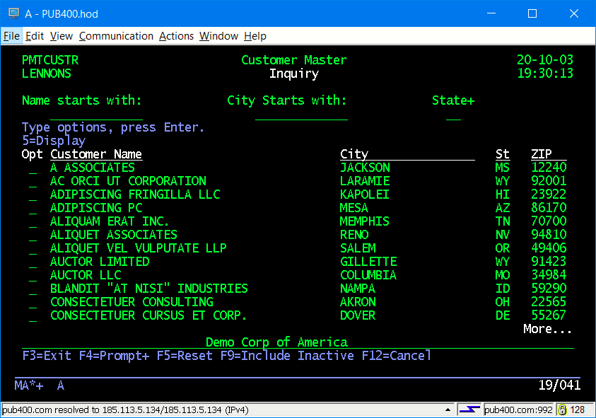 RPG program that puts up a 5250 subfile that allows searching by customer name, city and state. Display of Inactive records can be toggled using F9.