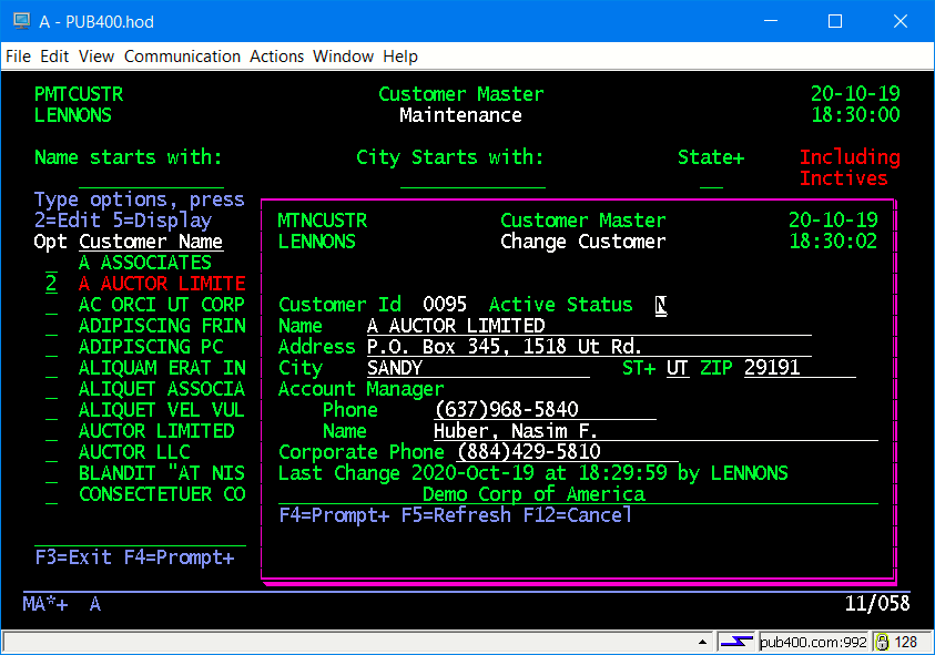 RPG program that maintains a customer. Customer id is provided as the first parameter. It also adds or displays a customer. Function is controlled by the second parameter. It is called from PMTCUSTR, but it could be called from any program that has a customer id available, or which needs to add a customer.