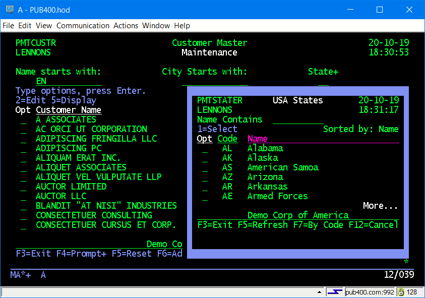 RPG program and window display file to prompt for a USA state code. Called when F4 is used in PMTCUSTR or MTNCUSTR. Display can be sequenced by either state name or 2-character code, toggled by F7.